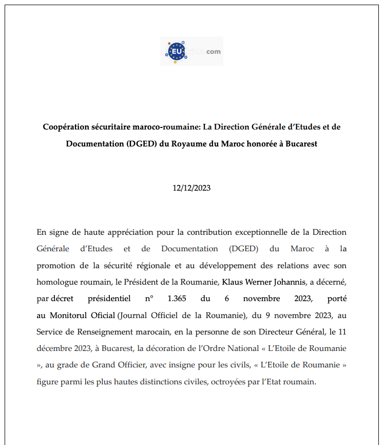 ووفق ما نقله موقع “أوروبريفز”، فقد جاء هذا التوشيح الدولي اعترافا بالعلاقات المتميزة بين البلدين في المجالات الاستخباراتية وتحقيق الأمن المشترك بين البلدين، فضلا عن الاعتراف بالدور المحوري الذي تلعبه أجهزة المخابرات المغربية في تحقيق الاستقرار الإقليمي والدولي، ومساهماتها في مكافحة التهديدات التي تمس بالأمن والسلم الدوليين، وكان آخرها الدور الرئيسي الذي لعبته المخابرات المغربية في إطلاق سراح مواطن روماني اختطفته مجموعة مرتبطة بالقاعدة في بوركينا فاسو.