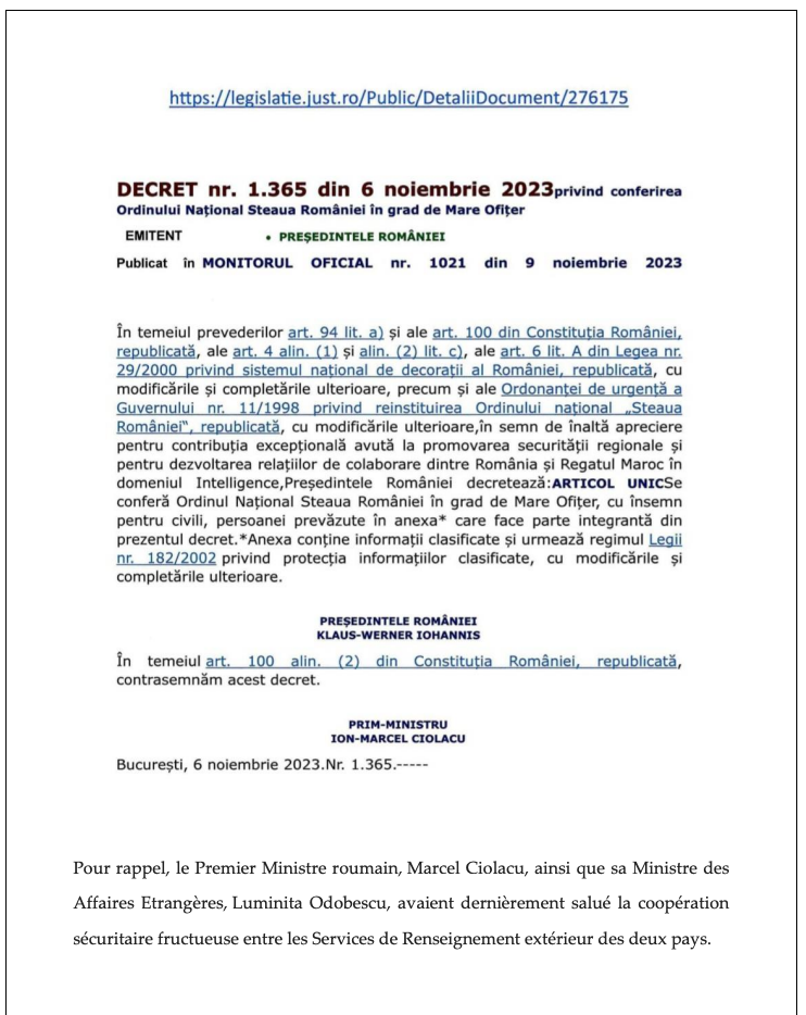 تتويجا للتعاون المميز في المجالات الاستخباراتية بين المملكة المغربية وجمهورية رومانيا، أصدر الرئيس الروماني كلاوس يوهانيس قرارا يقضي بمنح المخابرات الخارجية المغربية، المعروفة باسم المديرية العامة للدراسات والمستندات، في شخص مديرها العام محمد ياسين المنصوري، وسام “نجمة رومانيا” من درجة فارس كبير، وهي أسمى الأوسمة المدنية التي تمنحها جمهورية رومانيا.