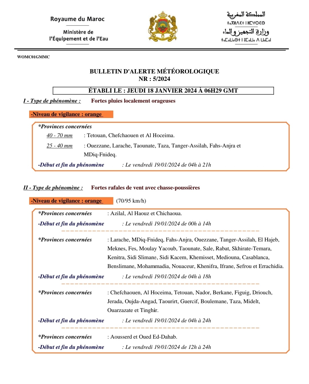 كما تهم هذه الظاهرة الجوية أقاليم شفشاون، والحسيمة، وتطوان، والناظور، وبركان، وفكيك، والدريوش، وجرادة، ووجدة-أنجاد، وتاوريرت، وجرسيف، وبولمان، وتازة، وميدلت، وورزازات وتنغير، وذلك ابتداء من يوم غد الجمعة على الساعة الرابعة صباحا إلى غاية منتصف الليل.