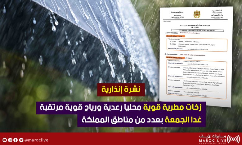 وأوضحت المديرية، في نشرة إنذارية من مستوى يقظة برتقالي، أن هذه التساقطات المطرية ستشمل كلا من تطوان، وشفشاون، والحسيمة، ووزان، والعرائش، وتاونات، وتازة، وطنجة-أصيلة، والفحص-أنجرة، والمضيق-الفنيدق، وذلك ابتداء من غد الجمعة على الساعة الرابعة صباحا إلى غاية التاسعة مساء .