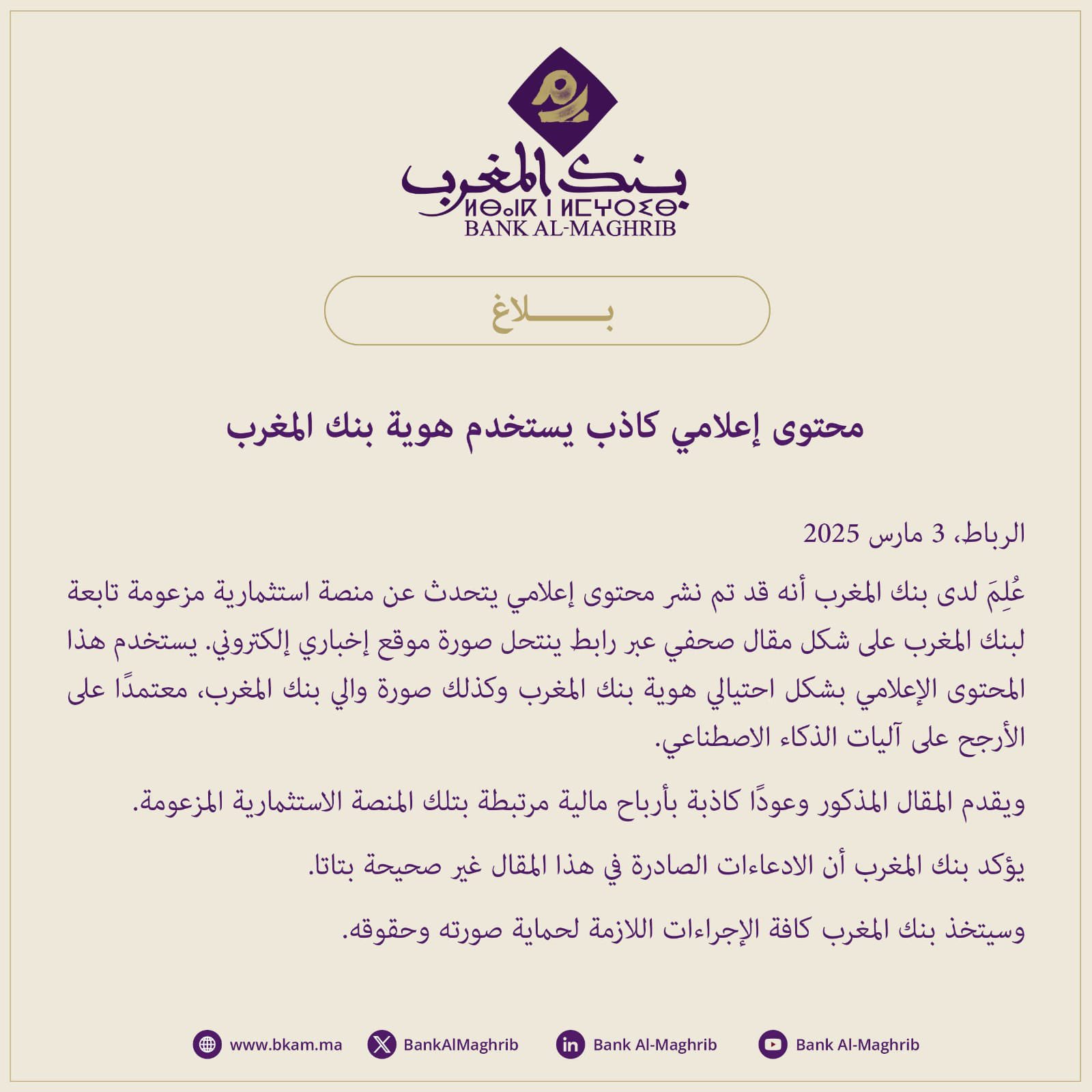 وذكر بنك المغرب، في بلاغ، أنه “تم نشر محتوى إعلامي يتحدث عن منصة استثمارية مزعومة تابعة لبنك المغرب على شكل مقال صحفي عبر رابط ينتحل صورة موقع إخباري إلكتروني”، موضحا أن “هذا المحتوى الإعلامي يستخدم بشكل احتيالي هوية بنك المغرب وكذلك صورة والي بنك المغرب، معتمدا على الأرجح على آليات الذكاء الاصطناعي”.