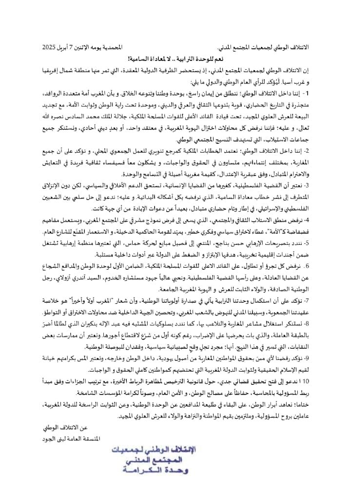 وفي ختام بلاغه، جدد الائتلاف الوطني لجمعيات المجتمع المدني عهده لأبرار الوطن، على البقاء في طليعة المدافعين عن الوحدة الوطنية، وعن الثوابت الراسخة للدولة المغربية، مؤكداً التزامه بروح المسؤولية، وقيم المواطنة والنزاهة والولاء للعرش العلوي المجيد.