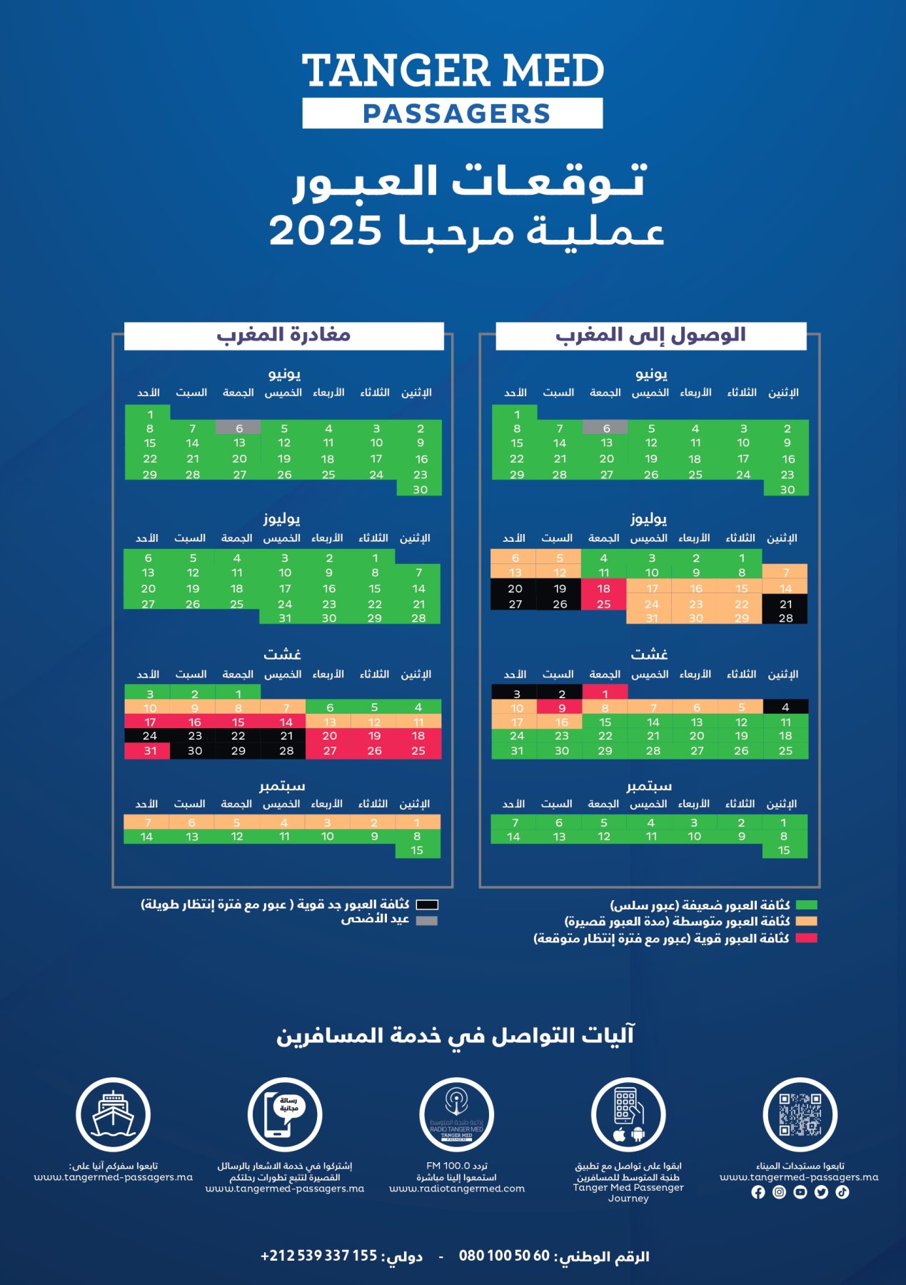 وبحسب المعطيات المتوفرة، يُدعى المسافرون إلى الاطلاع بانتظام على توقعات حركة المرور التي تنشرها سلطات ميناء طنجة المتوسط، والتخطيط لعبورهم مع تجنّب فترات الذروة، ضماناً للسير الجيد للعملية.