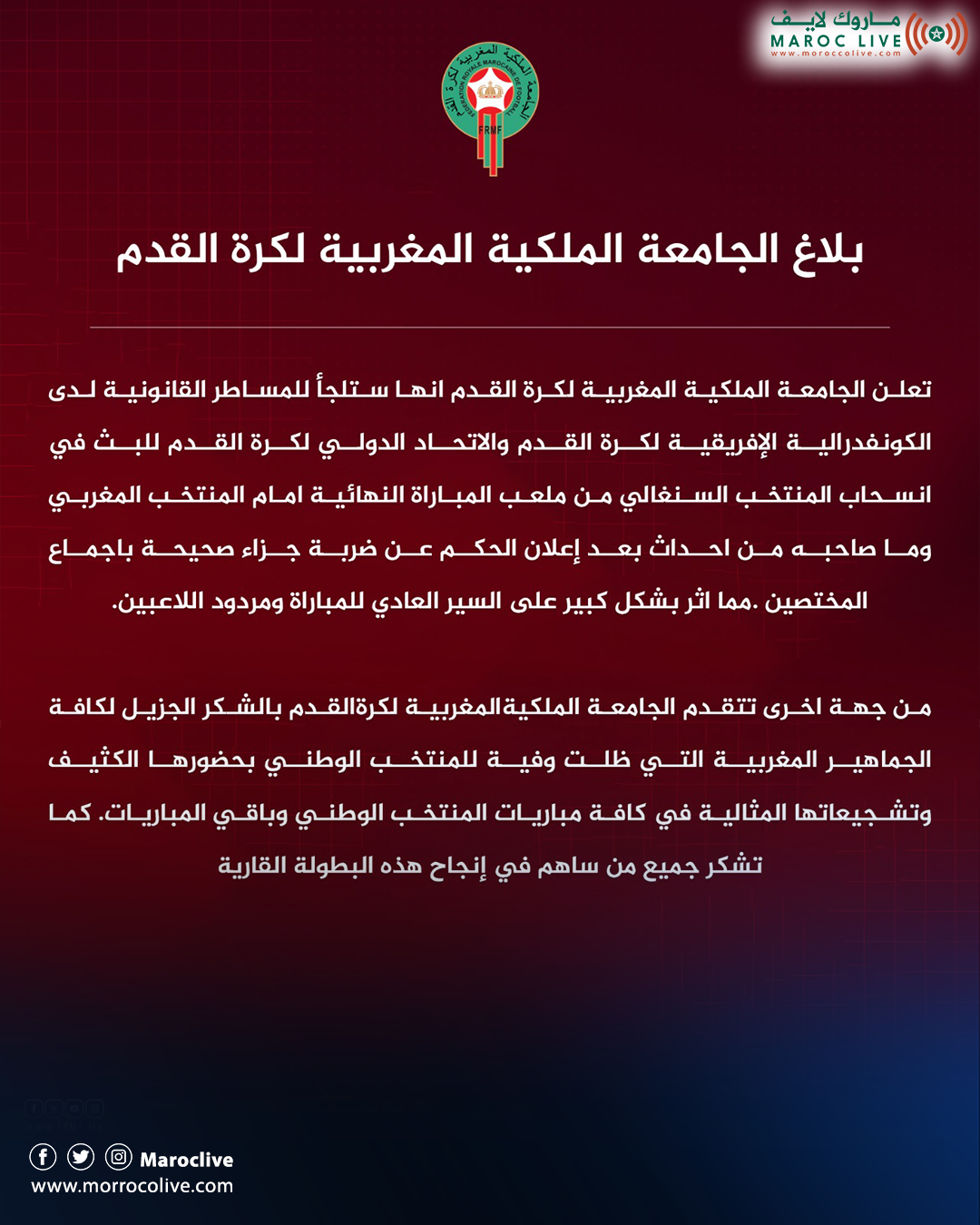 أعلنت الجامعة الملكية المغربية لكرة القدم، اليوم الاثنين 19يناير 2026، أنها ستلجأ للمساطر القانونية لدى الكونفدرالية الإفريقية لكرة القدم، والاتحاد الدولي لكرة القدم، للبث في انسحاب المنتخب السنغالي من ملعب المباراة النهائية، أمام المنتخب المغربي وما صاحبه من أحداث بعد إعلان الحكم عن ضربة جزاء صحيحة باجماع المختصين.