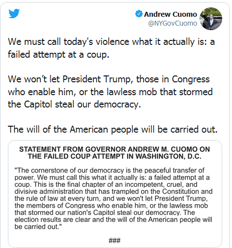 دان حاكم نيويورك أندرو كومو والمدعية العامة لنيويورك ليتيتيا جيمس، عملية اقتحام مبنى الكابيتول من قبل أنصار الرئيس دونالد ترامب، واصفين إياها بأنها محاولة انقلابية أثارها الرئيس.