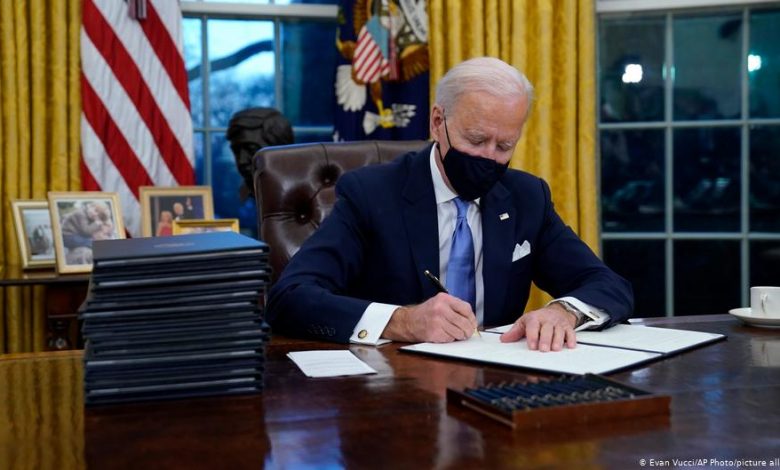 في خطوة تؤكد إصرار الرئيس الجديد على القطيعة مع إرث سلفه دونالد ترامب، اتخذ جو بايدن قرارات أبرزها إلغاء حظر دخول الأشخاص من دول ذات أغلبية مسلمة وعودة واشنطن إلى اتفاق باريس للمناخ وإلى عضوية منظمة الصحة العالمية.
