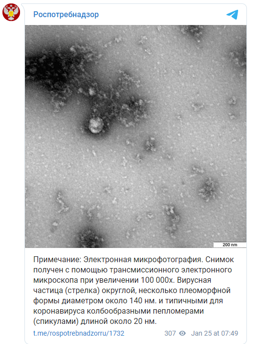 ووفقا لبيان صادر عن هيئة حماية المستهلك الروسية، تم التقاط الصورة المجهرية للفيروس كجزء من الدراسة المستمرة لخصائص هذا النوع من فيروس كورونا الجديد، بما في ذلك سماته الهيكلية والنماذج التجريبية باستخدام حيوانات المختبر.