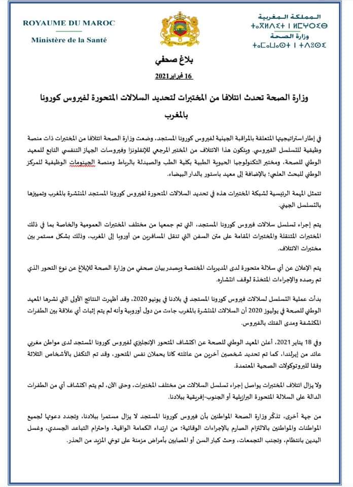 ولفت البلاغ إلى أنه يتم الإعلان عن أي سلالة متحورة لدى المديريات المختصة وإصدار بيان صحفي من طرف وزارة الصحة للإبلاغ عن نوع التحور الذي تم رصده والإجراءات المتخذة لوقف انتشاره.