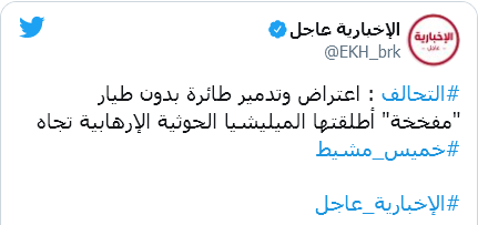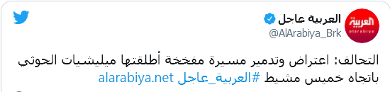 أفاد الإعلام الرسمي السعودي بأن التحالف العربي بقيادة الرياض، اعترض طائرة مسيرة مفخخة أطلقتها جماعة “أنصار الله” (الحوثيون) صوب خميس مشيط بجنوب السعودية.