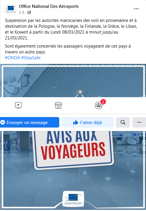 أفاد المكتب الوطني للمطارات أن السلطات المغربية قررت تعليق الرحلات الجوية من وإلى بولندا، النرويج، فنلندا، اليونان ،لبنان، الكويت، وذلك إلى غاية 21 مارس 2021، بسبب تداعيات انتشار “فيروس كورونا”.
