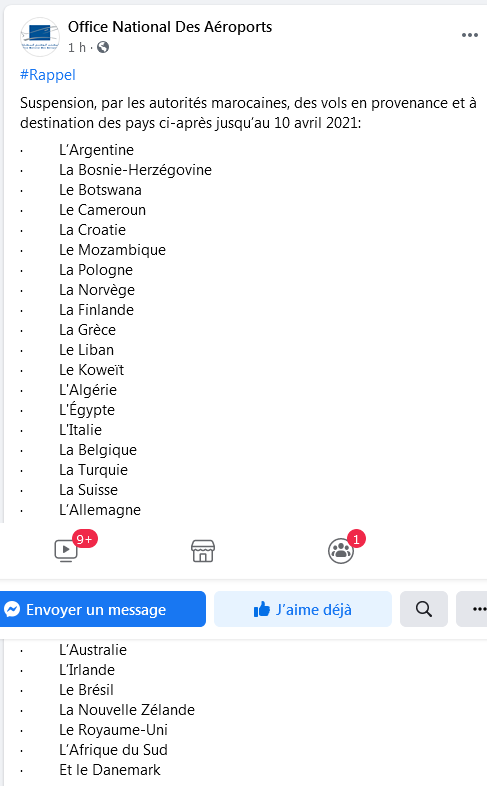 وأفاد المكتب الوطني للمطارات اليوم الخميس، أن السلطات المغربية مددت تعليق الرحلات الجوية للبلدان 32 إلى غاية 10 أبريل 2021.