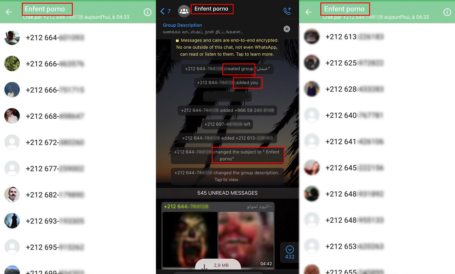 و حسب ما صرح أحد الضحايا، “يتم ذلك عبر إنشاء مجموعات داخل تطبيق واتساب باستعمال عدة أرقام وهمية، ويقوم بإضافة الضحية للمجموعة وينشر فيها صور وفيديوهات عنيفة يظهر فيها أطفال صغار يمارس عليهم الجنس، ثم يبلغ برقم اخر إدارة واتساب من أجل حظر الحساب بحيث يتم تكرار العملية لعدة مرات”، حتى يتم حظر الحساب نهائيا.