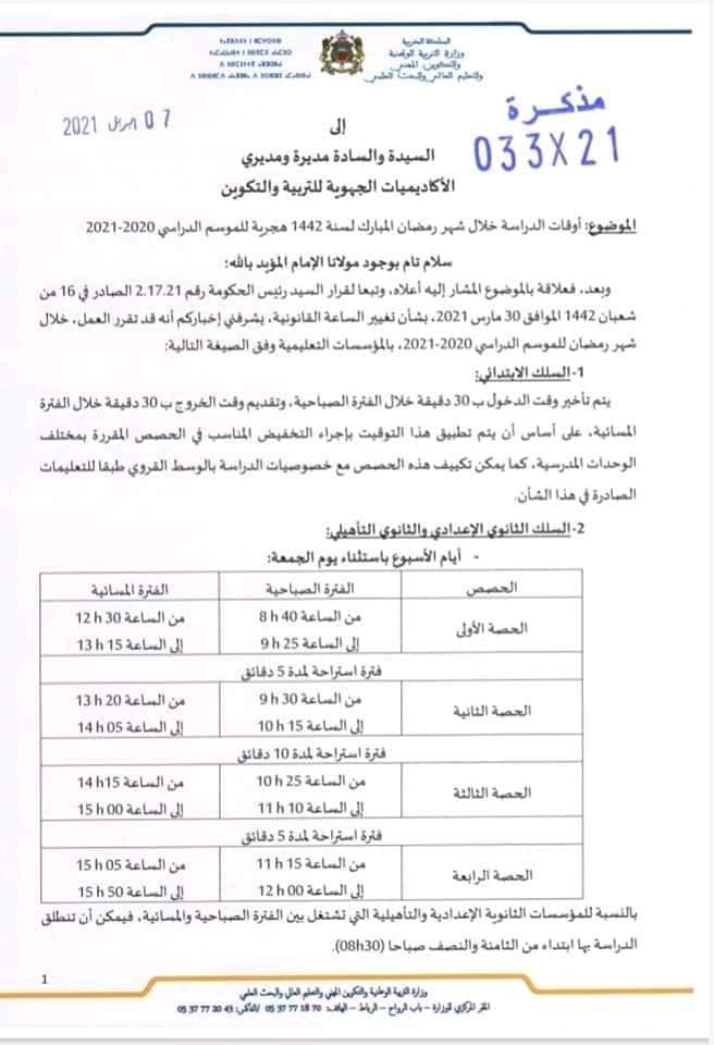 وجاء في المذكرة الوزارية الموجهة إلى مدراء الأكاديميات الجهوية للتربية والتكوين، أن مواعيد دخول مؤسسات السلك الابتدائي، سيتم تأخيرها بنصف ساعة، فيما سيتم تقديم مواعيد المغادرة بالمدة الزمنية نفسها.