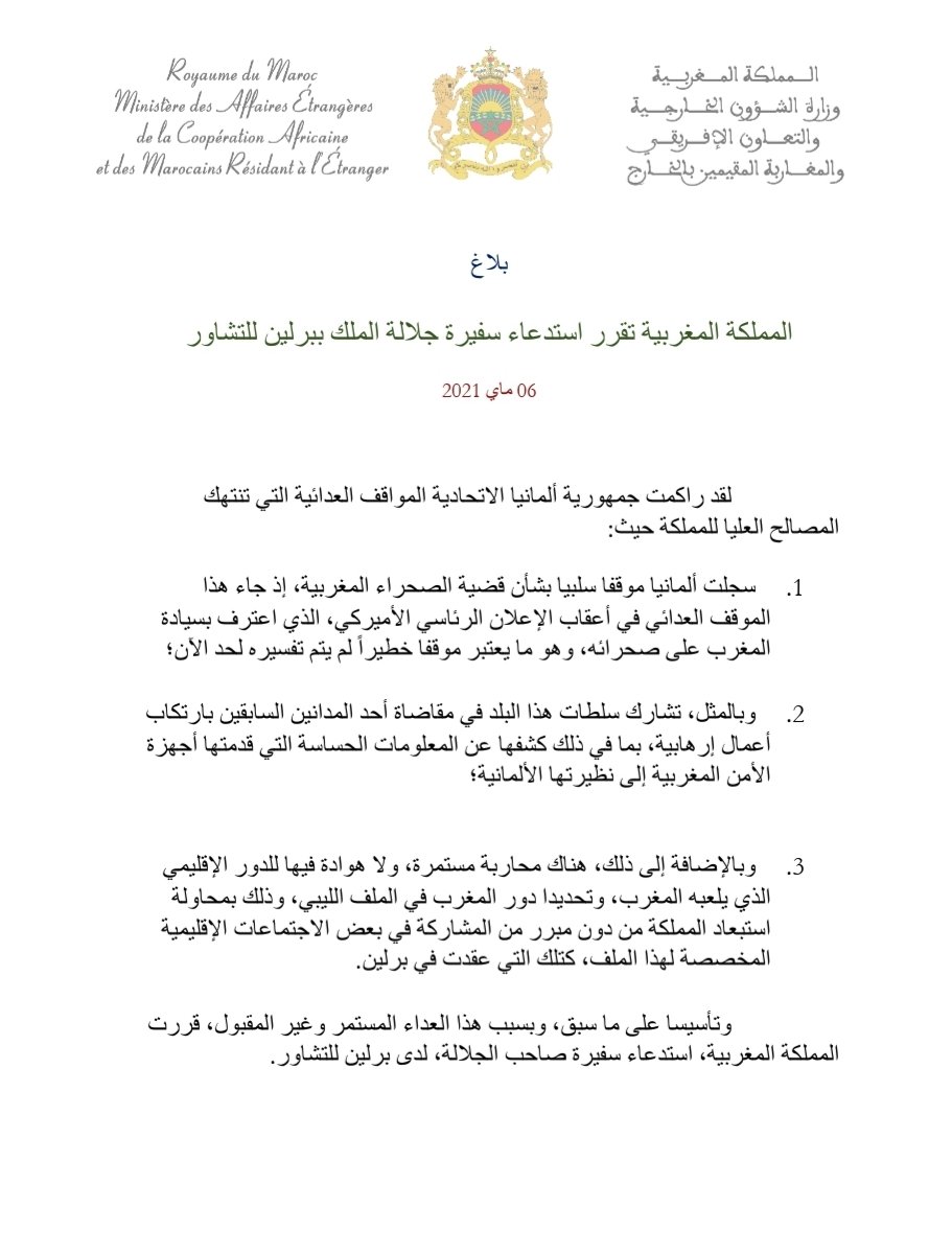 وتأسيسا على ما سبق، وبسبب هذا العداء المستمر وغير المقبول، خلص بلاغ وزارة الشؤون الخارجية والتعاون الإفريقي والمغاربة المقيمين بالخارج إلى أن المملكة المغربية، قررت استدعاء سفيرة صاحب الجلالة، لدى برلين للتشاور.