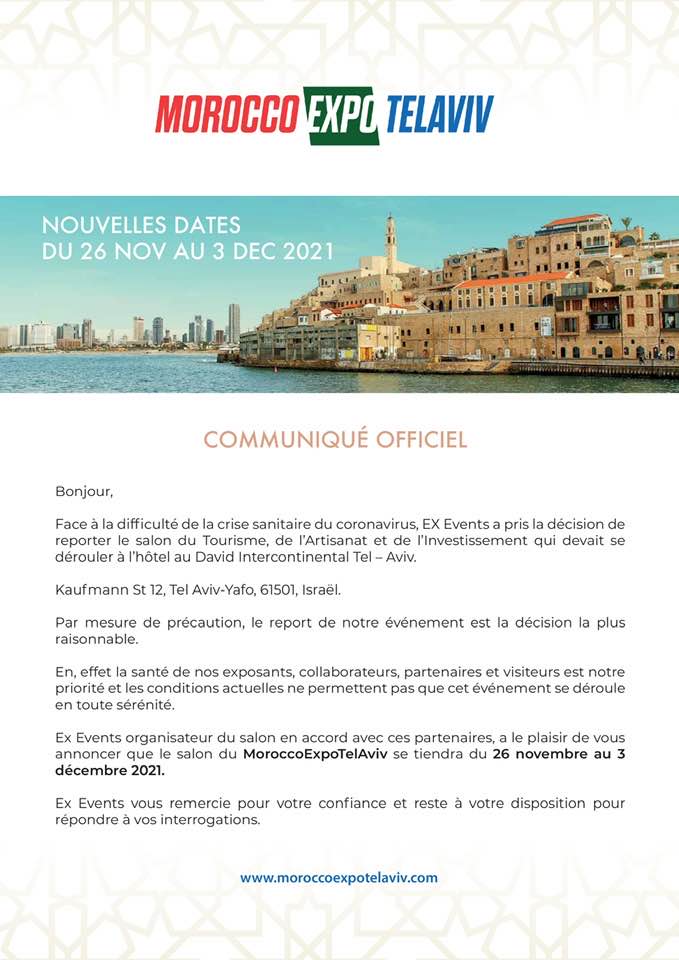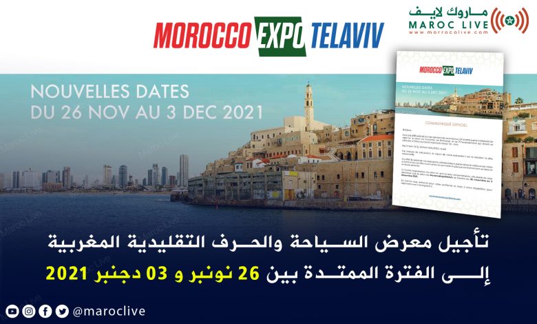 أعلنت اللجنة المنظمة لفعاليات النسخة الأولى من معرض السياحة والحرف التقليدية المغربية، المقرر تنظيمه في مدينة تل أبيب الإسرائيلية عن تأجيل المعرض إلى الفترة الممتدة ما بين 26 نونبر و 03 دجنبر 2021.
