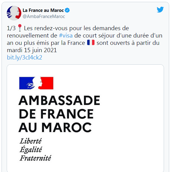 أعلنت السفارة الفرنسية بالمغرب، أن مواعيد تجديد التأشيرات قصيرة الأمد (سنة أو أكثر)، سيتم فتحها من جديد، ابتداء من الثلاثاء 15 يونيو.