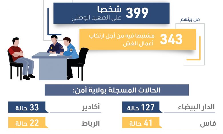 أسفرت العمليات الأمنية التي باشرتها مصالح المديرية العامة للأمن الوطني لزجر أعمال الغش في الامتحانات الوطنية الموحدة للباكالوريا برسم الموسم الدراسي 2020-2021، والتي شملت الدورتين العادية والاستدراكية، عن ضبط 399 شخصا على الصعيد الوطني، من بينهم 343 مشتبها فيه من أجل ارتكاب أعمال الغش، والباقي يشتبه في تورطهم في قضايا تتعلق بجرائم الحق العام، من بينها قضايا المس بالأشخاص والممتلكات وحيازة أشياء محظورة.