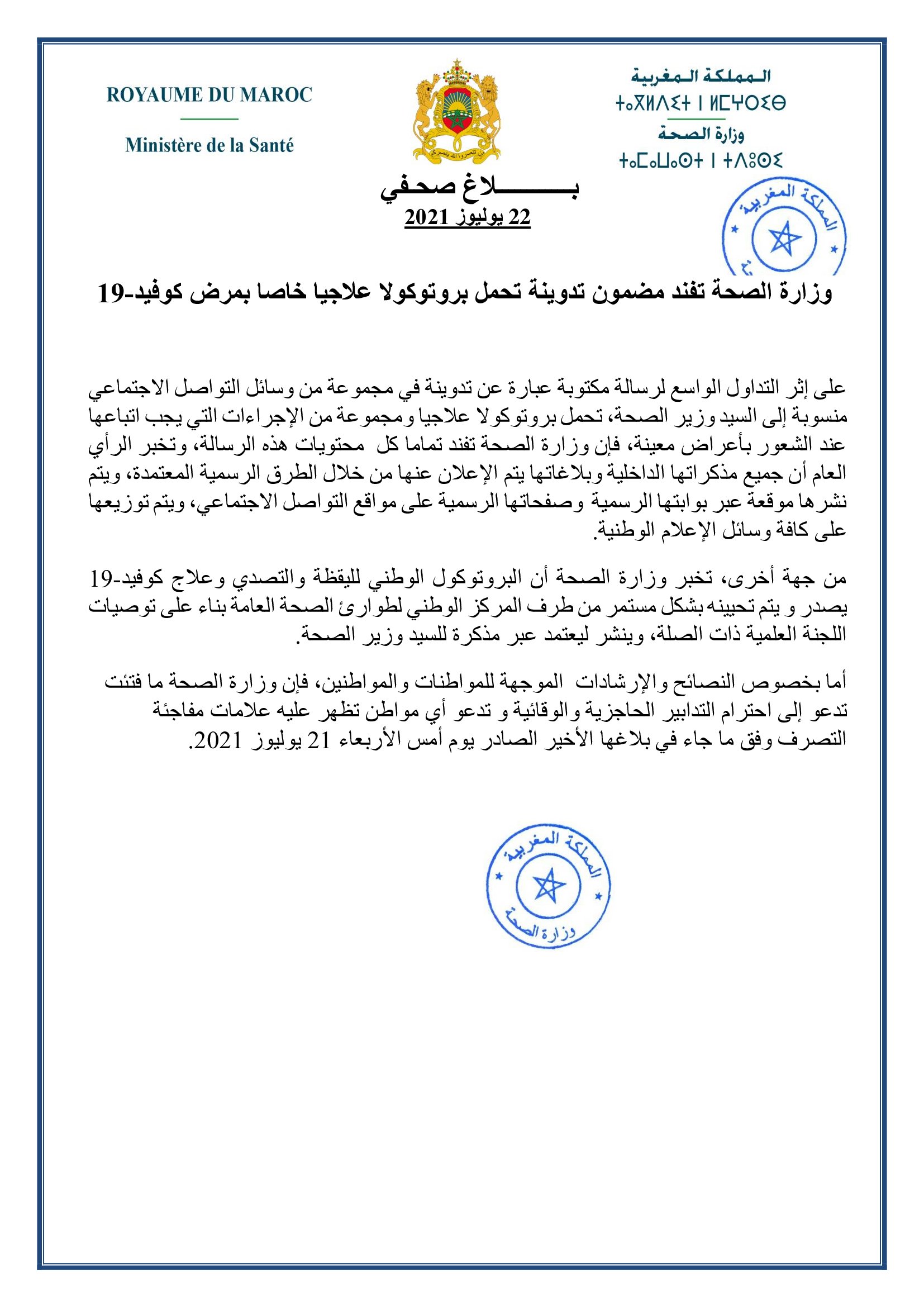 وحسب البلاغ، فإن وزارة الصحة تؤكد أن جميع مذكراتها الداخلية وبلاغاتها يتم الإعلان عنها من خلال الطرق الرسمية المعتمدة، ويتم نشرها موقعة عبر بوابتها الرسمية وصفحاتها الرسمية على مواقع التواصل الاجتماعي، ويتم توزيعها على كافة وسائل الإعلام الوطنية.