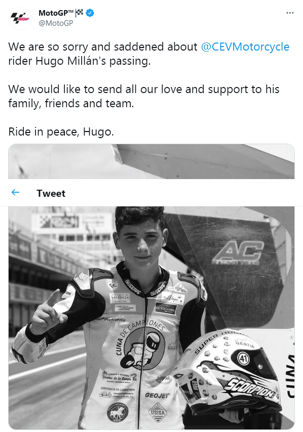 لوفاة المتسابق هوغو ميلان.. نود أن نرسل كل حبنا ودعمنا لعائلته وأصدقائه وفريقه.. أرقد بسلام يا هوغو”.