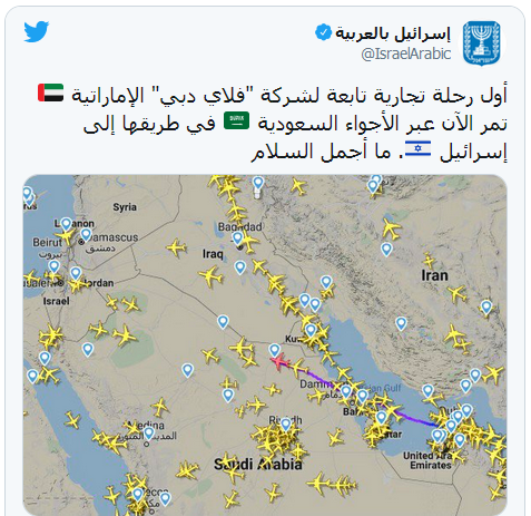 وفي السياق نفسه، ذكر حساب “إسرائيل بالعربية” التابع لوزارة الخارجية الإسرائيلية عبر “تويتر” أن “رحلة “فلاي دبي” مرت عبر الأجواء السعودية وهي في طريقها إلى إسرائيل”.