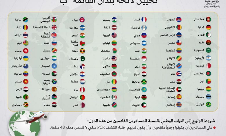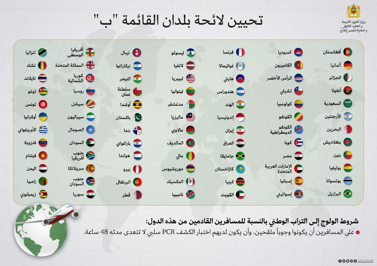 قامت اللجنة بين الوزارية للتنسيق وتتبع لوائح الأسفار الدولية خلال جائحة كوفيد-19 بتحديث هذه اللوائح على ضوء آخر التطورات المتعلقة بالوضعية الوبائية في المغرب والعالم. وأشارت اللجنة، في بلاغ، إلى أن تصنيف البلدان وفق اللوائح (أ) و (ب) وكذا شروط الولوج إلى التراب الوطني، يتم وضعه بناء على معطيات موثوقة من الإدارات الصحية في الدول والمنظمات الدولية.