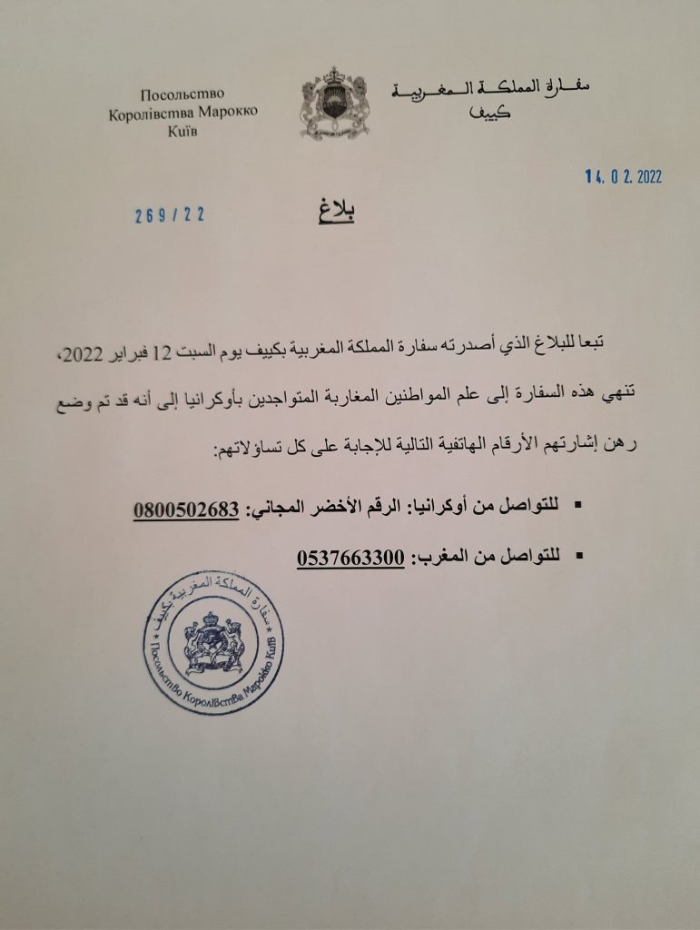 كما دعت السفارة المواطنين المغاربة الراغبين في السفر إلى أوكرانيا إلى تأجيل سفرهم في الوقت الراهن.