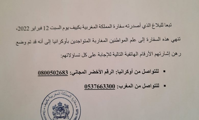 سفارة المغرب بكييف تضع رهن إشارة المغاربة المتواجدين بأوكرانيا رقمين هاتفيين للإجابة على كل تساؤلاتهم