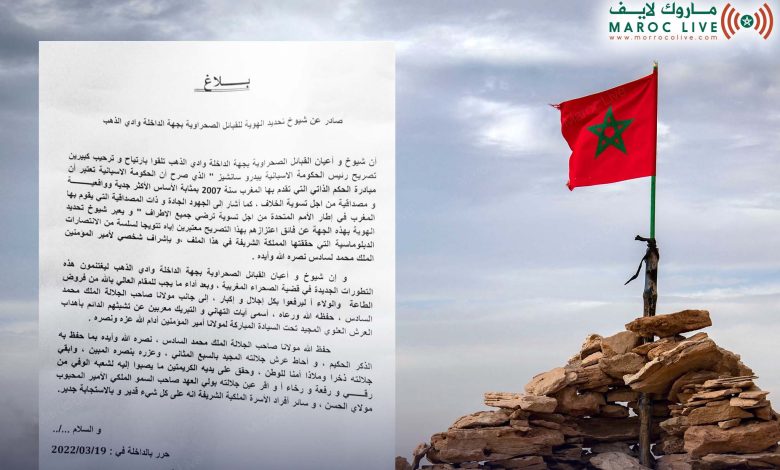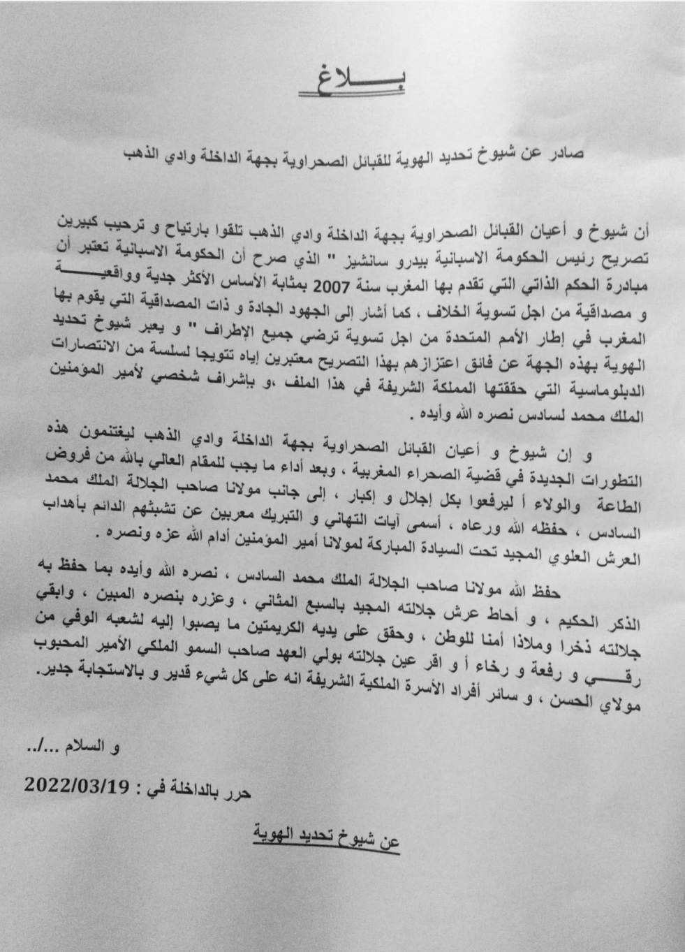 في مايلي بلاغ لشيوخ القبائل الصحراوية بجهة الداخلة وادي الذهب: