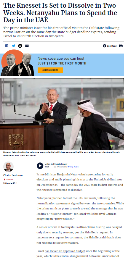 وقالت صحيفة “Haaretz” الإسرائيلية، في تقرير لها، إن نتنياهو يستعد للقيام بـ”زيارة تاريخية” إلى الإمارات يوم 23 الشهر الجاري، مشيرة إلى أن هذا الموعد قد يتزامن مع حل الكنيست، في حال عدم المصادقة على ميزانية الدولة.
