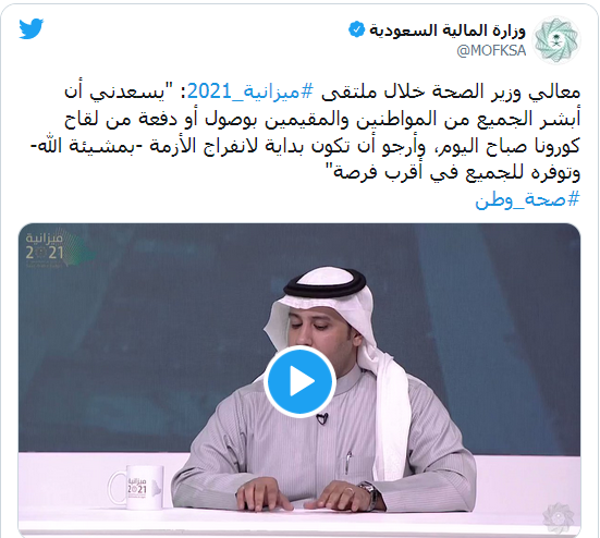 وأعلن وزير الصحة السعودي الدكتور توفيق الربيعة، وصول أول دفعة من لقاح كورونا إلى المملكة صباح اليوم، وقال إن اللقاح سيوفر بشكل مجاني للجميع، وأن الأولوية في اللقاح لمن لديهم أمراض مزمنة ومن تجاوز عمرهم فوق الستين عاما.